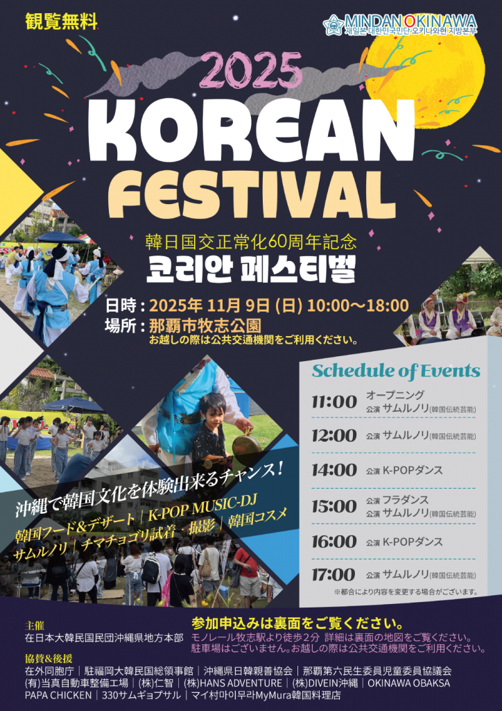 ■협찬・후원: 在外同胞庁│駐福岡大韓民国総領事館│沖縄県日韓親善協会│那覇第六民生委員児童委員協議会│(有)当真自動車整備エ場│(株)仁智│(株)HANS ADVENTURE│(株)DIVEIN沖縄│OKINAWA OBAKSA│PAPA CHICKEN│330サムギョプサル│マイ村마이무라MyMura韓国料理店